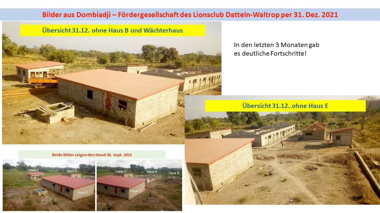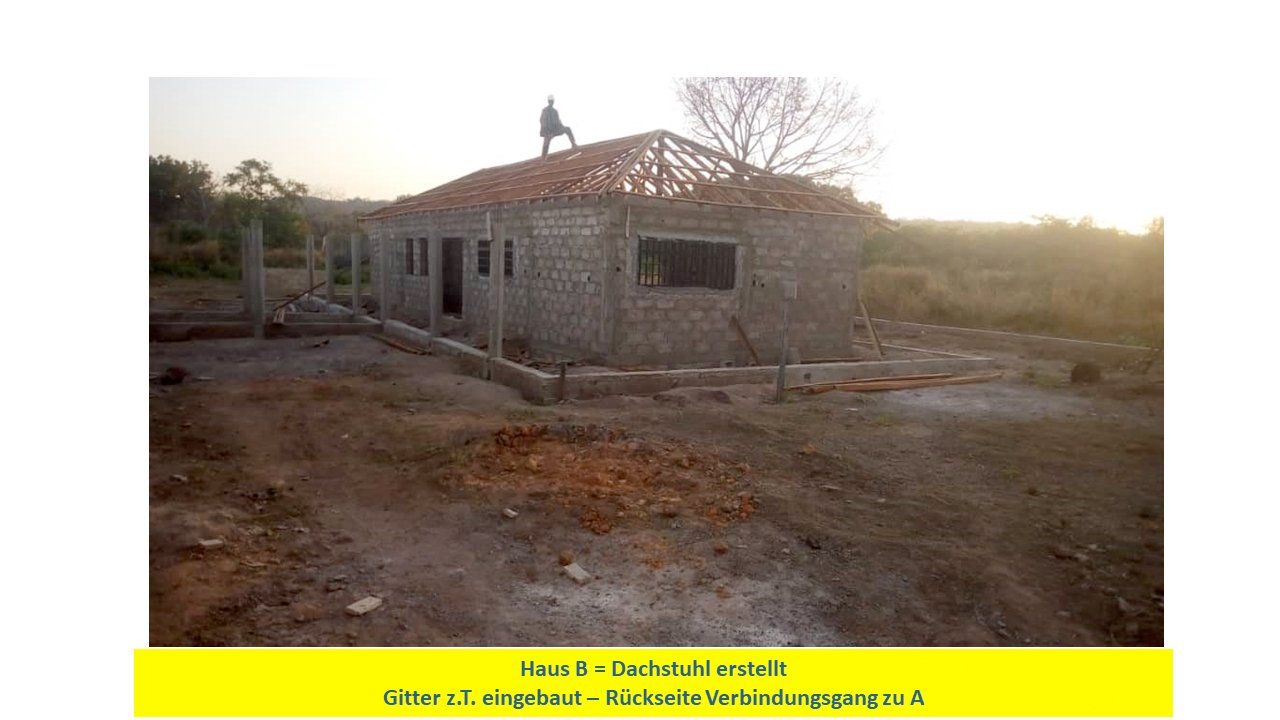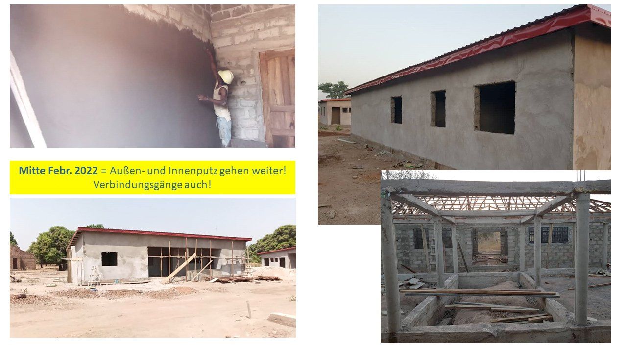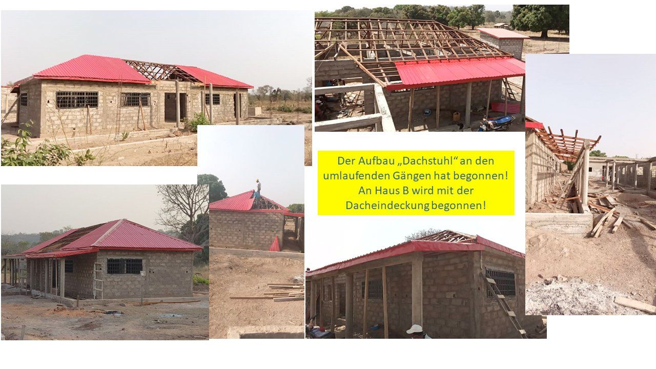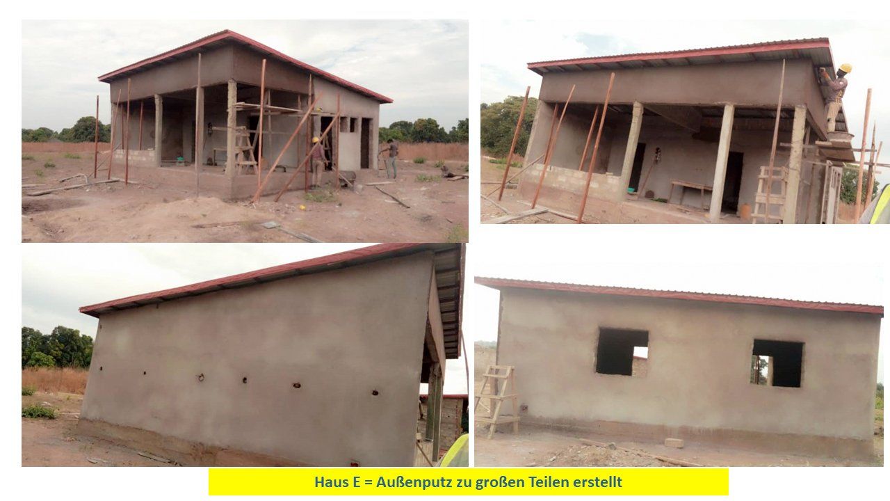 Die Rohbauarbeiten laufen insbesondere noch im Haus A. Der Elektriker hat in anderen Häusern mit der Verlegung von Kabeln begonnen. Dacharbeiten an den Häusern C, D und E sind erledigt und Haus B begonnen. Für die Verbindungsgänge von B nach A und von A nach D sind mit den Erdarbeiten abgeschlossen und es wurde mit den Betonarbeiten begonnen; ebenso bei den Vordächern. Das Wächterhaus wurde ebenfalls gebaut. Die das Gelände begrenzende Mauer ist zum Teil gebaut. Innen- und Außenputz sind im Haus E erfolgt; begonnen wurde im Haus C.