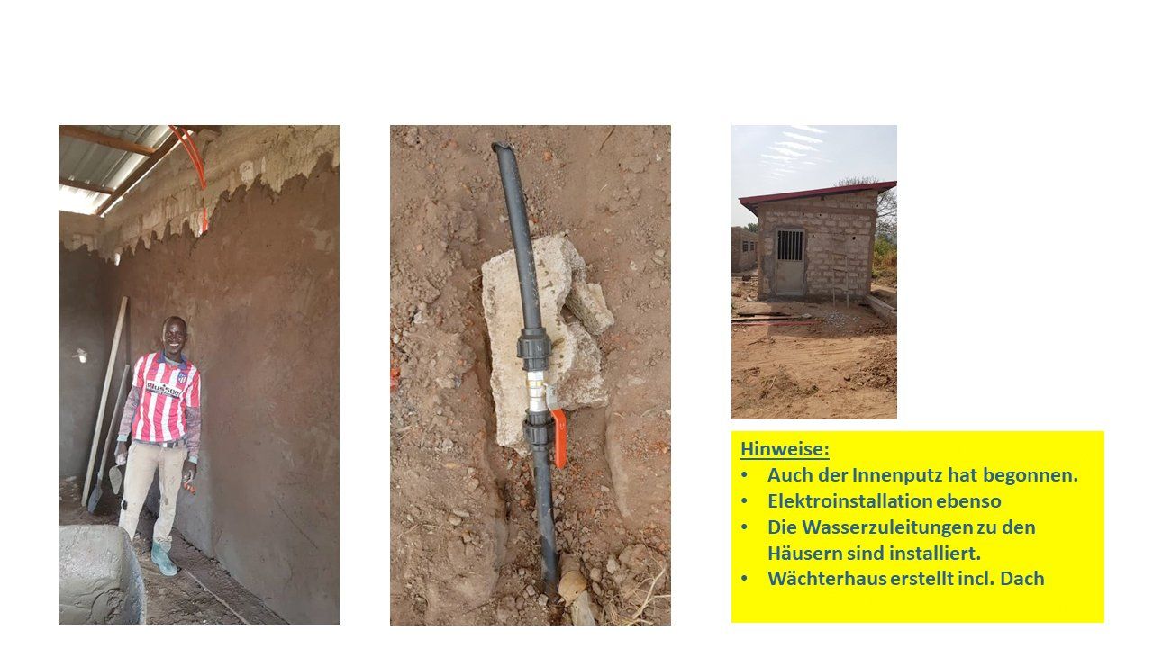 Les travaux de gros œuvre sont encore en cours, notamment dans la maison A. L'électricien a commencé à poser des câbles dans d'autres maisons. Les travaux de toiture des maisons C, D et E sont terminés et ceux de la maison B ont commencé. Pour les couloirs de liaison de B à A et de A à D, les travaux de terrassement sont terminés et les travaux de béton ont commencé ; il en va de même pour les auvents. La maison du gardien a également été construite. Le mur qui délimite le terrain est en partie construit. Les enduits intérieurs et extérieurs ont été réalisés dans le bâtiment E ; les travaux ont commencé dans le bâtiment C.